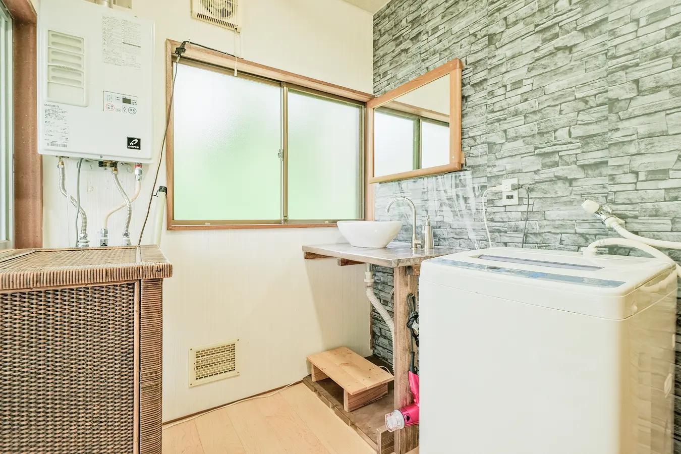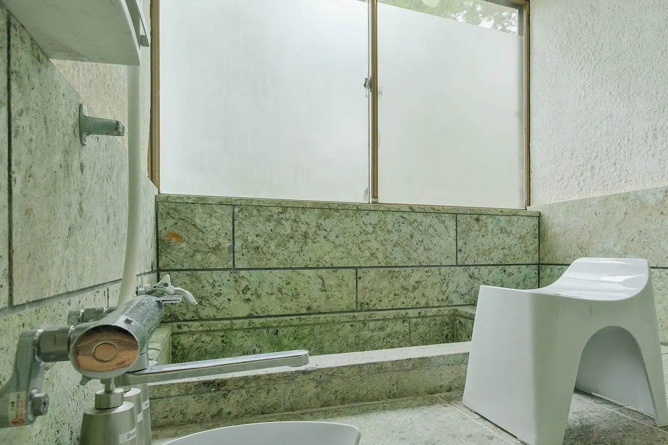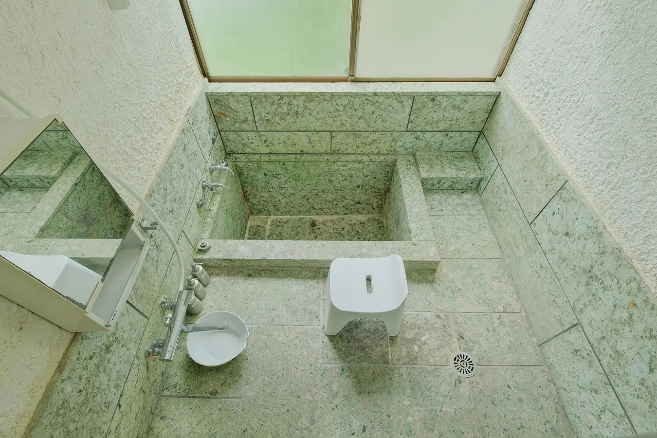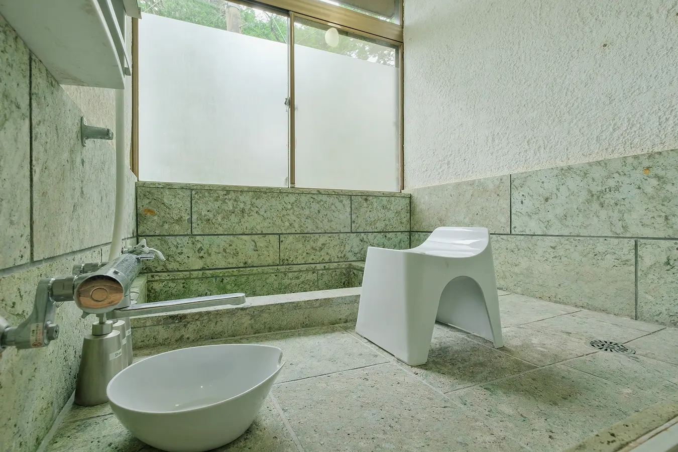 伊豆石張りの浴室で、